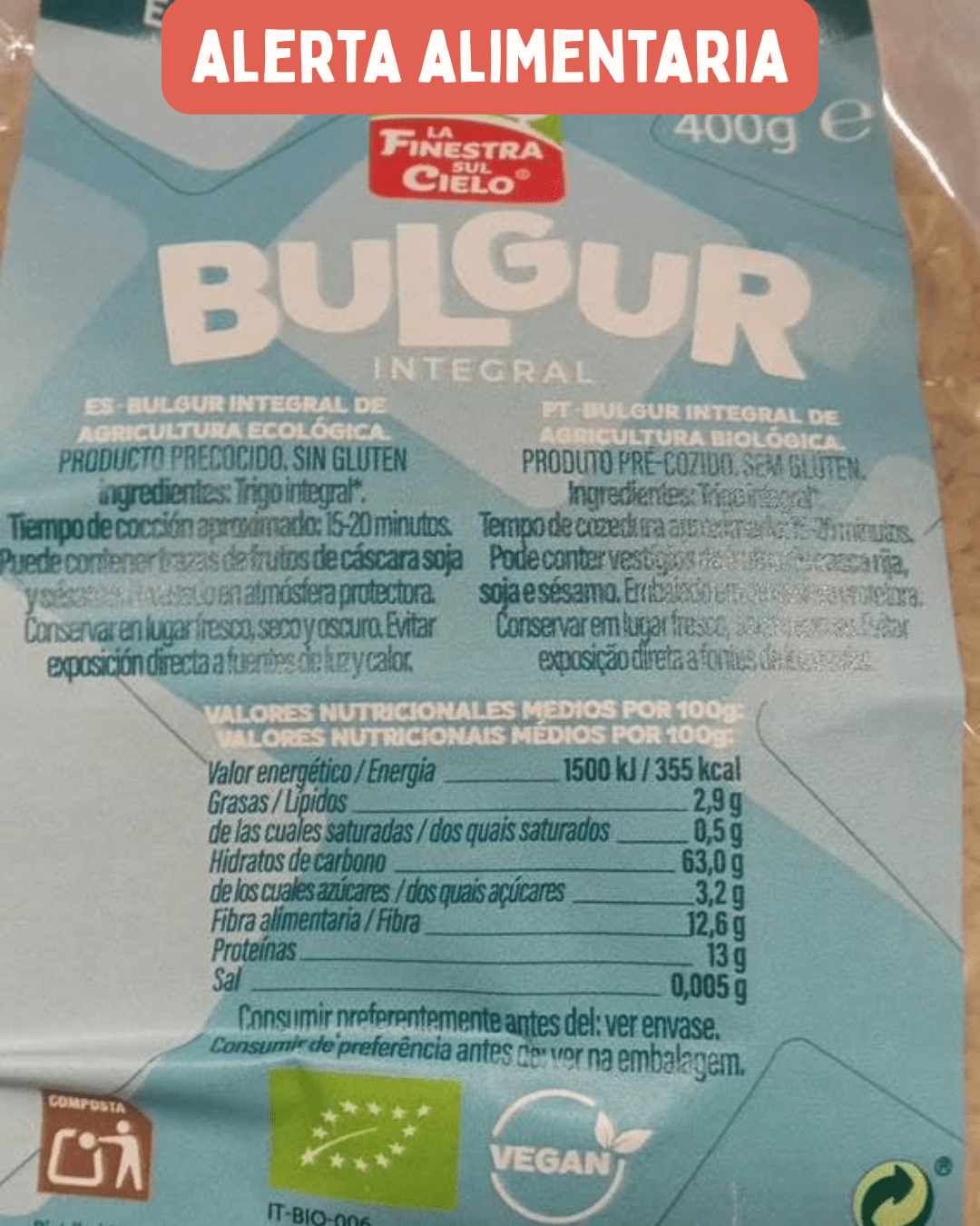 FACE nos informa de una nueva alerta alimentaria. Se trata del producto Bulgur Integral de la marca La Finestra Sul Cielo. El producto contiene gluten e incluye «trigo integral» en sus ingredientes, pero lleva incorrectamente la mención «sin gluten».