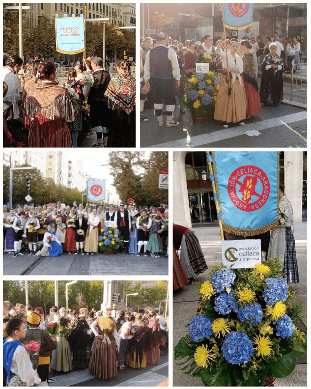Más de doscientas personas de la Asociación Celíaca Aragonesa participaron en la Ofrenda de Flores, donde, un año más, se ofreció el tradicional ramo a la Virgen del Pilar.
