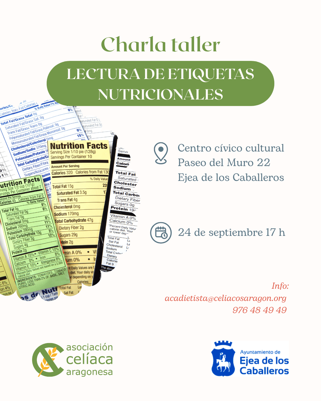 El miércoles 24 de septiembre, a las 17 horas, en el Centro Cívico Cultural de Ejea de los Caballeros (Zaragoza), realizaremos una charla taller, para socios y no socios, en la que aprenderemos a interpretar la información que nos proporcionan las etiquetas de los alimentos.