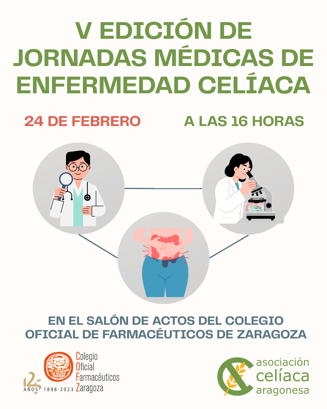 El 24 de febrero, a partir de las 16 horas, en el salón de actos del Colegio Oficial de Farmacéuticos de Zaragoza, celebraremos la 5ª edición de nuestras Jornadas Médicas bianuales, en las que contaremos con la participación de destacados profesionales sanitarios del sector. Durante la jornada se abordará la Enfermedad Celíaca, haciendo especial hincapié en la importancia de su diagnóstico precoz y en su abordaje y tratamiento integral.