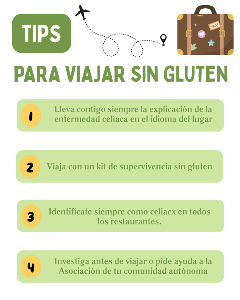 Además, es muy aconsejable llevar siempre comida sin gluten no perecedera (galletas, pan, snacks, etc.) durante el viaje, para disponer de una opción segura en caso de dificultad para encontrar alimentos aptos.